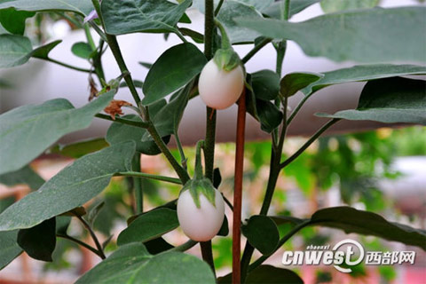 据太白县农技中心副主任赵志国介绍,此次培育出的“蛋茄”是去年春季从甘肃天水神州绿盆科技有限公司引进的一种新型的太空茄子。所谓的太空茄子就是利用卫星和飞船等太空飞行器将植物种子带上太空,再利用其特有的太空环境条件,如宇宙射线、微重力、高真空、弱地磁场等因素对植物的诱变作用产生各种基因变异,再返回地面选育出植物的新种质、新材料、新品种。该茄子先进行初期育种,再进行移栽,从初期的育种到茄子的成熟要经过三个月的生长期,这种茄子初期开的花为紫色,结出的果实形状似鹅蛋,皮厚,生长最大为60克左右,成熟初期为白色,果实成熟后为黄色,由于其生长周期长,所以“蛋茄”的观赏性强,无食用价值。