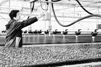 图为园区工人通过智能数控进行育苗。