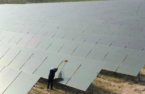 9月9日,在河北永清高科技阳光农业示范区,一位农民在为太阳能光伏电池板搞清洁。