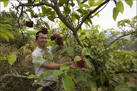 血藤果实香甜可口,根蔓可作中药,一般生长在森林里的荫凉地带,与树木伴生。2012年春,贵州省榕江县三江乡乌坡农民黄秀勇利用自家梨园的梨树枝干作蔓架,栽培200多株野生血藤。今年,血藤开始挂果,产量平均每株5公斤左右,预计明年可进入盛产期,平均每株产值将达200元。黄秀勇的成功经验,吸引了不少村民前来参观取经。(新华社发 黄秀福摄)