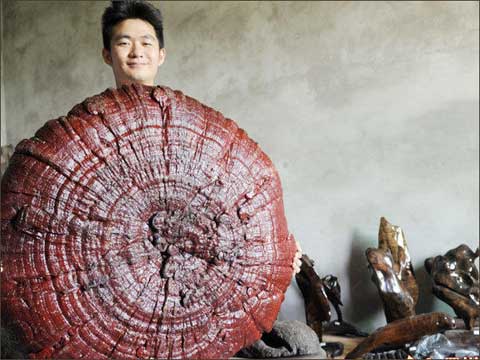 连日来,在南充城郊搬罾场,居民们无不对杨木匠家那朵大灵芝啧啧称奇。现场测量,它直径92厘米,重5.15公斤,活脱脱就是一把雨伞。杨家儿子称这是朋友从广东寄来的野生灵芝菌,但专业人士则认为,它属于人工培育的可能性极大。(中国农业新闻网)