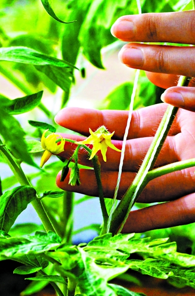 科技人员检查番茄的授粉状况。温室展示区内采用最新的栽培技术,避免高温多湿的环境中产生病虫害,实现最佳的展示效果。