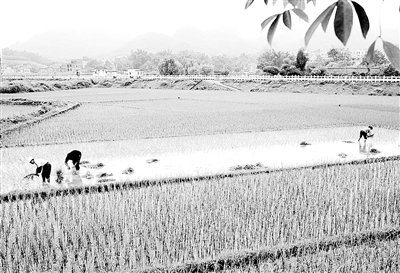 8月14日,广西来宾市忻城县城关镇都乐村的农民在田间抢种晚稻。广西农民抢抓时机对农作物施肥打药、除草补苗,确保秋粮丰收。(樊绍光 摄)