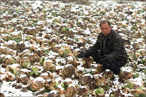在晋中市寿阳县平头镇韩沟村,菜农韩铁林看着雪地里被冻坏的茴子白一筹莫展(11月7日摄)。