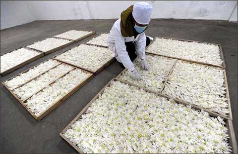 据了解,经烘干处理后单朵菊花的市场价格在17元左右,今年该村菊花销售可为当地带来超过6000万元的经济效益。(新华社记者 李晓果摄)