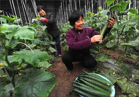 11月19日,在河北霸州西粉营村现代设施农业示范园,农民在大棚内采摘黄瓜。