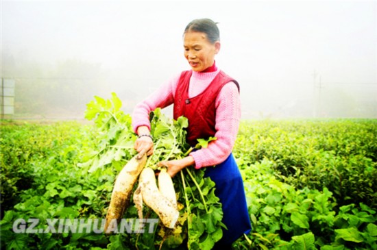 新华网贵州频道11月24日电 印江自治县新业乡落坳村的田地里,到处是绿油油的一片。这里的萝卜个头大,颜色青绿,水分充足,非常新鲜,产量达数十万斤。目前已经成熟待售。(李玥 新华网贵州频道)