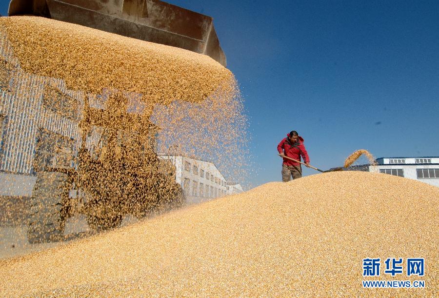 新华社照片,锦州(辽宁),2014年12月4日 我国粮食总产量实现“十一连增” 辽宁省锦州市义县七里河国家粮食储备库员工在晾晒收购的玉米。(李铁成 摄)
