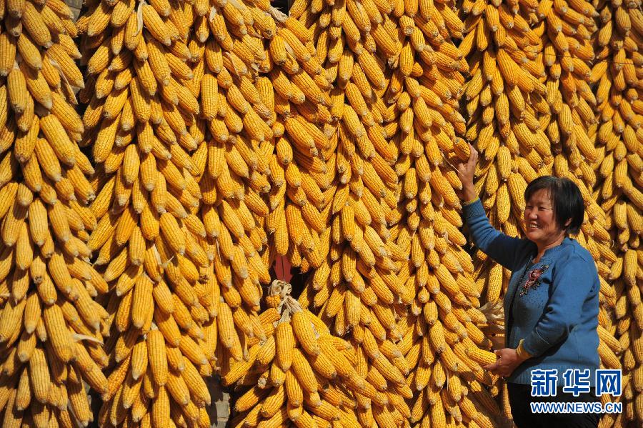 新华社照片,运城(山西),2014年12月4日 我国粮食总产量实现“十一连增” 山西运城市新绛县泉掌镇西韩村农民王巧英在晾晒收获的玉米。(高新生 摄)