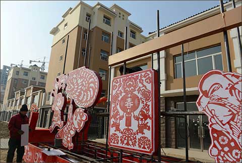 施工人员在内蒙古自治区包头市北梁棚改新区——惠民新城安装迎春彩灯。