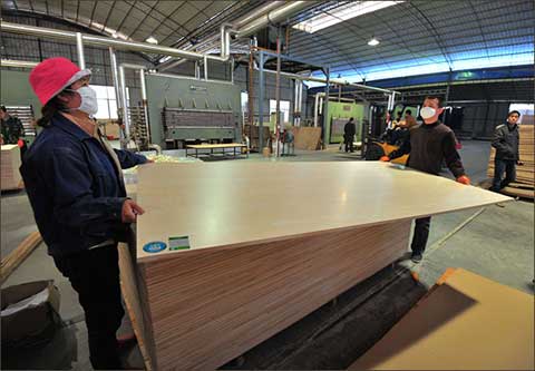 12月12日,融安县壮象木业有限公司的工人在检验成品胶合板。