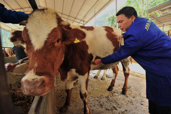 12月14日,在广西柳州市融安县宏康生态养殖场,技术员丁善勇在检查牛的健康状况。