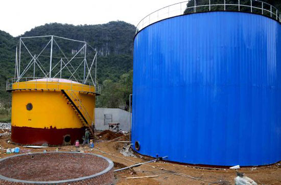 12月14日在广西柳州市融安县宏康生态养殖场拍摄的一座利用畜禽排泄物发酵产气的大型沼气池。