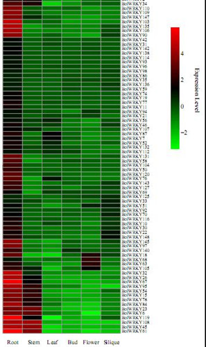 图2. 甘蓝WRKY基因在不同组织(根、茎、叶、花苞、花、荚果)中的表达谱比较
