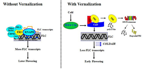 研究表明,在春化过程中,持续低温诱导 WRKY34 基因上调表达,并启动 CUL3A 的表达,同时 LRB1/2 蛋白作为桥梁招募 CUL3A 与 FRI 形成蛋白复合物,驱动 FRI 的泛素化降解,从而解除了 FRI 蛋白对 FLC 的上调作用以及 FLC 对植物开花的抑制作用,最终导致植物早花。以前的春化机制研究侧重于低温信号如何对 FLC 以及其它开花相关基因的表观遗传调控,该研究则更多地关注低温信号如何通过调控春化相关蛋白本身的动态变化来影响植物开花,为植物春化现象的机理研究提供了新视角。