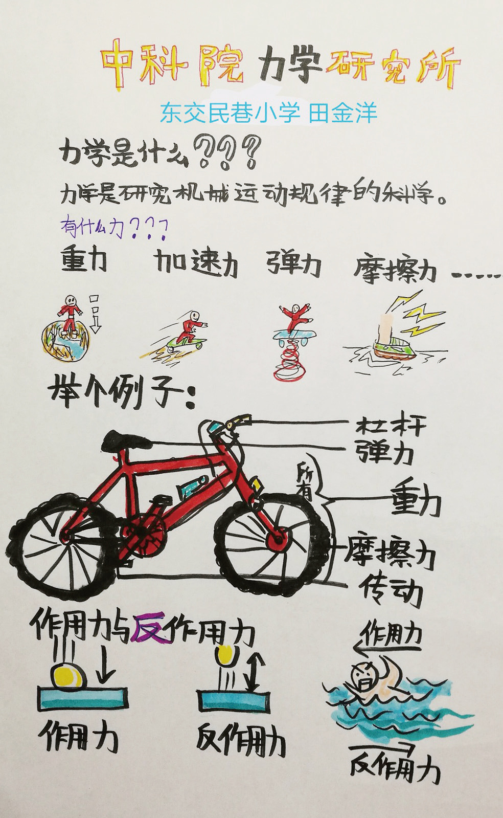 正像李家春院士演讲时所讲的:“关于人生目标,首先要有偶像,其次要有兴趣,最后要确立自己的理想。”通过这次参观活动,给我开启了人生努力方向的另一条道路。回家后,我翻阅了相关的书籍,这幅图是我对力学的简单理解,它像一块磁石一样,吸引了我的兴趣,希望能通过以后的活动,更加深入地了解科学,实践科学,运用科学。