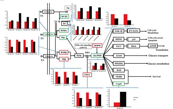 以饰纹姬蛙转录组unigene为靶基因文库,用miRanda(3.3a)对21个显著差异表达miRNA进行靶基因预测,共预测了10,206 unigenes为差异miRNA的靶基因,对这些基因进行功能富集发现,PI3K-Akt通路被显著富集。一个复杂特异的miRNA:mRNA互作网络图可以更清晰地揭示它们的相互关系,于是研究人员利用转录组数据、miRNA文库表达量、miRNA-靶基因的调控关系,构建了TH通路miRNA-靶基因的调控网络。共有10个显著性差异表达的靶基因参与TH信号通路,其中HSP90, PTEN, RXRβ和TRβ为上调,而TRα, RXRα和type I iodothyronine deiodinase (D1)和 transthyretin下调。在这个通路中,上调的mfi-miR-10a, mfi-miR-10b, mfi-miR-148b, mfi-miR-9a-5p和 mfi-miR-9b-5p通过调控TRα表达调节变态发育过程。TH通路中PI3k-Akt信号通路在靶基因KEGG富集分析中也被显著富集了。Casp9-mfi-miR-181b的相互作用也通过TH通路调控饰纹姬蛙的变态发育。