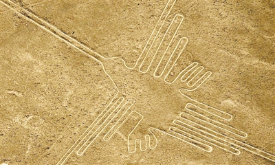 纳斯卡线条——一种只有在高空才能看清全貌的神秘地画。这些地画包括螺旋线、箭头、锯齿形和波浪线等线条;三角形、矩形和梯形等几何图形;蜂鸟、鲸鱼、猴子、树木和花朵等动植物图案,以及一些无法辨认的图形。学者们认为,这些地画最早出现于公元前1世纪前后,线条集中于秘鲁南部的纳斯卡平原约500平方公里的区域内。