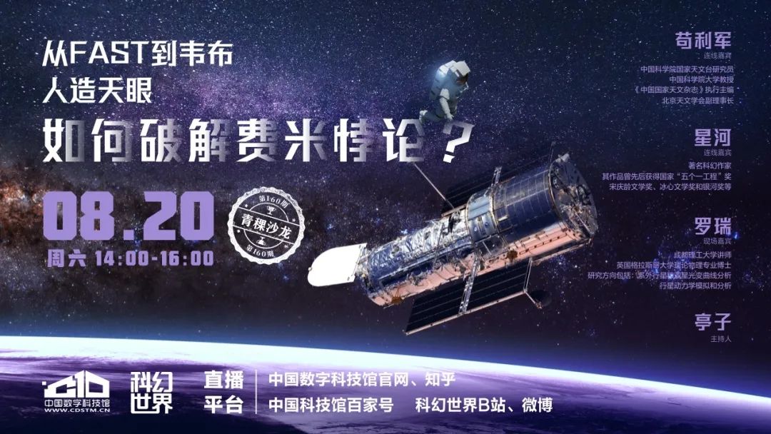 为此,8月20日下午,由中国科技馆主办的第160期青稞沙龙在线上直播中解答了这些问题。这次,我们邀请到了苟利军、星河、罗瑞等3位科普、科幻领域的嘉宾,与主持人亭子一起,从“韦布望远镜公布全彩宇宙图像”这一热点事件出发,探讨“从FAST到韦布,人造天眼如何破解费米悖论?”这一话题,为公众学习积累天文常识,感悟天文类科幻作品的魅力,提供丰富多样的参考与建议。