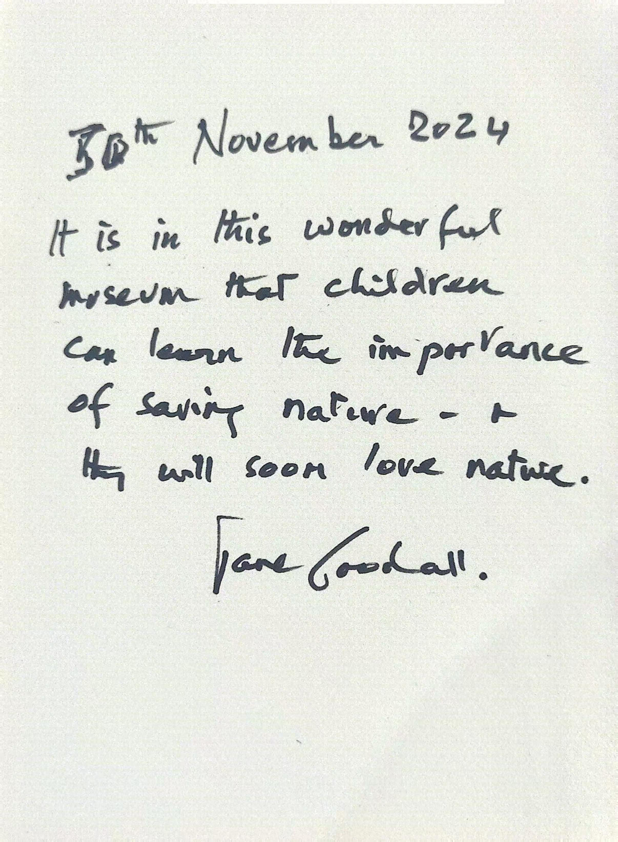 在中国科技馆,珍·古道尔博士写下寄语:孩子们在这座绝妙的博物馆里学习到保护自然的重要性,这也必将激励他们更加热爱自然。