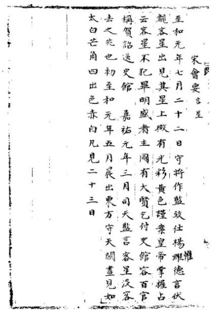 “嘉祐元年三月,司天监言:“客星没,客去之兆也。初,至和元年五月,晨出东方,守天关,昼见如太白,芒角四出,色赤白,凡见二十三日。”