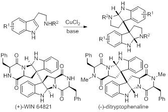 最近,夏成峰课题组在原先报道的二价铜引发自由基的研究基础上,又成功发展了一种二价铜介导的高效构建 3a,3a'-二聚吡咯吲哚骨架的新方法。该方法同样利用氯化铜引发自由基,经环化、二聚串联反应,一步高效地生成了 3a,3a'-二聚吡咯吲哚骨架,而且该方法的底物应用范围非常广泛。在自然界中同时存在 endo 和 exo 两种不同构型的 3a,3a'-二聚吡咯吲哚天然产物,已报道的方法无法立体选择性地进行合成。夏成峰带领的团队发现,通过简单更换侧链保护基,就能实现良好的 endo/exo 选择性。利用该方法,该团队只用了五步反应,就完成了复杂天然产物(+)-WIN 64821 和(-)-ditryptophenaline 的非对映选择性高效全合成。同时,该全合成路线能以克级规模进行,这为今后的动物实验提供了基础。