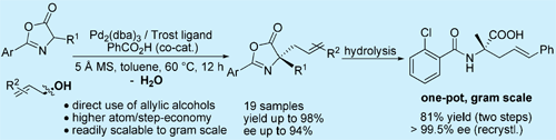 中国科学院兰州化学物理研究所羰基合成与选择氧化国家重点实验室蒋高喜“百人计划”项目团队最近在该领域取得新进展。他们使用商品化的手性配体,在少量苯甲酸共催化条件下实现了烯丙醇对噁唑酮的不对称烯丙基化,然后原位水解,“一锅法”高效实现了含有烯丙基的季碳氨基酸的合成。
