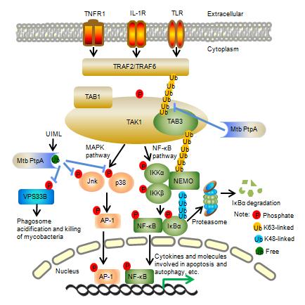 最近,中国科学院微生物研究所研究员刘翠华与中科院院士高福以及北京师范大学教授邱小波及其团队合作,发现结核分枝杆菌利用宿主细胞的泛素分子,进而抑制宿主固有免疫功能的机制,为胞内病原菌逃逸宿主固有免疫系统的监控和清除提出了新途径和视角。该研究有助于阐明结核分枝杆菌潜伏感染及致病的机制,同时为基于病原-宿主互作界面的抗结核药物研发提供了新的策略和靶点。该项研究揭示了结核分枝杆菌中分泌性酪氨酸磷酸酶PtpA可通过抑制宿主天然免疫相关信号通路(包括JNK及p38 MAPK信号通路和NF-κB信号通路)而促进结核分枝杆菌在巨噬细胞内的存活。结核分枝杆菌感染巨噬细胞后可分泌PtpA至巨噬细胞中。PtpA一方面可作为磷酸酶直接去磷酸化宿主细胞中的p-JNK和p-p38蛋白,从而抑制MAPK信号通路的激活;而另一方面,PtpA还能以磷酸酶活性非依赖性的方式与宿主细胞NF-κB信号通路中的关键信号转导分子TAB3竞争结合泛素链,从而抑制NF-κB信号通路。PtpA通过抑制MAPK信号通路和NF-κB信号通路干扰宿主的细胞因子(包括TNF, IL-1β和IL-12)的表达,并促进分枝杆菌在巨噬细胞内的存活(请见附图)。