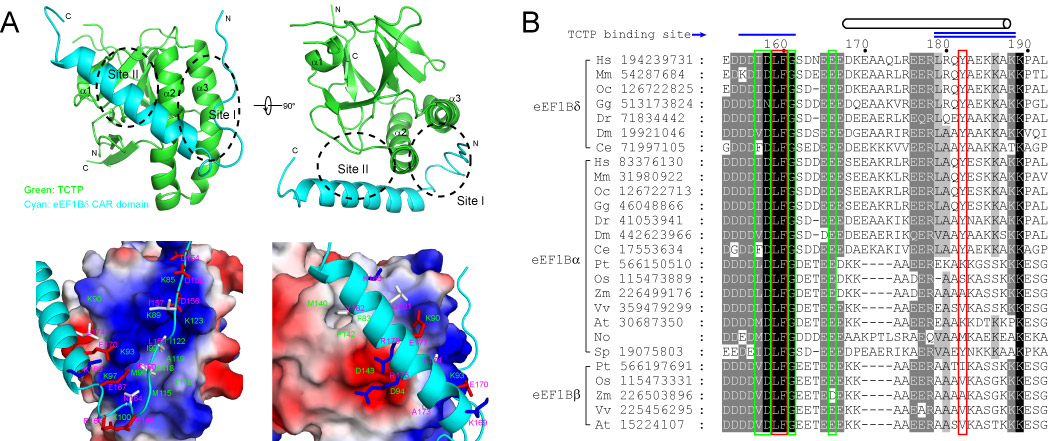 研究表明,eEF1Bδ上的一个新的CAR结构域是负责参与TCTP相互作用的关键区域,该区域通过疏水和静电相互作用与TCTP形成复合体。序列分析表明,该CAR结构域在所有真核生物的eEF1B复合体中的核苷交换因子中都保守。进一步使用酵母和光合微藻(微拟球藻)的TCTP和eEF1Bα蛋白对其之间相互作用进行验证,表明该相互作用在整个真核生物中都保守,可能代表了TCTP的一个基本的生物学功能。TCTP与已报道的其他蛋白质的相互作用也都缺少相应的结构生物学研究,该研究工作为这些蛋白质相互作用的进一步研究提供了范例。
