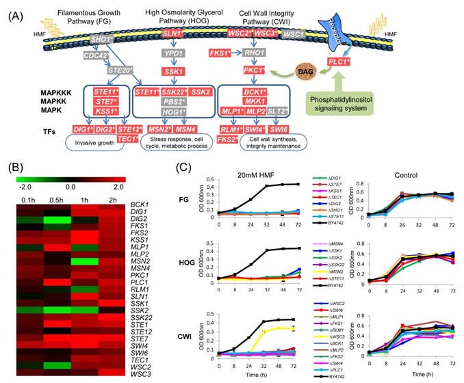 图1.工业酵母NRRL Y-12632 MAPK 信号转导通路基因组和转录组分析(A)HMF刺激后上调表达基因用红色表示;含有非同义突变的基因用*表示;(B) HMF 刺激2h基因表达;(C)含20mM HMF 培养基中单基因敲除酵母突变体生长曲线。