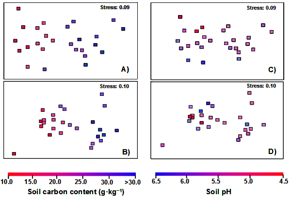 在土壤因素驱动真菌空间分布格局研究方面,发现土壤全碳含量与土壤真菌数量呈显著正相关关系,而与土壤pH值无关;全碳含量还与土壤真菌一些分类单元丰度成显著的正或负的相关关系,土壤全碳含量是驱动黑土农田土壤微生物地理分布格局的主要土壤因子。