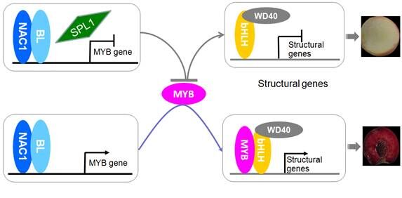 “血桃”不仅外观艳丽夺目,而且富含花青苷具备清除体内自由基、抗癌防老等保健功效,深受消费者青睐。研究人员通过遗传作图将控制血桃呈色基因定位于一个200kb区间,然后结合比较转录组学研究,克隆了控制血桃着色基因BL,该基因位于花青苷MYB调节基因的上游,在果实发育后期能与其他NAC基因形成异质二聚体激活MYB基因的转录,进而促进花青苷代谢相关基因的表达,最终导致果肉大量积累花青苷呈血色。但在果实发育前期SPL1基因抑制BL基因的表达,因而果实不现红色。