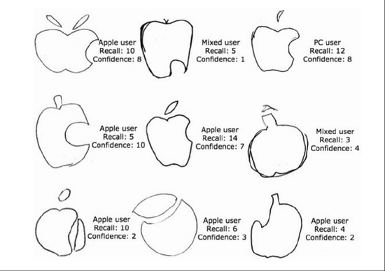 这些标志画在纸上,错误比比皆是。有的画出了大体的样子,但存在一些细节上的错误,比如把咬痕画错了地方,或是在苹果上画了两个蒂。还有的则把标志完全画错了,有的画的是一个扁平的手雷,还有的看起来是一个百事可乐的标志。不过这项研究表明,这种“睁眼瞎”并不只局限于画苹果标志的时候——当让这些学生从一组相似的图标中挑选出正确的苹果标志时,只有47%的学生选出了正确的标志。在这项测试中,苹果产品的用户比其它电脑用户的正确率略高,但进行这项研究的科学家说两个群体的成功率没有显著性的差异。