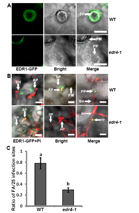 中国科学院遗传与发育生物学研究所唐定中课题组利用拟南芥与白粉菌互作的研究体系,通过生化、遗传学和细胞学手段,克隆了拟南芥EDR4基因,解析了EDR4参与植物免疫的分子机制。通过突变体筛选,发现EDR4功能缺失导致植物白粉病抗性增强,抗性相关基因激活,水杨酸高度积累。精细的亚细胞定位结果表明EDR4蛋白定位于细胞质膜、早胞体/反式高尔基体、高尔基体和晚胞体,并在胞内不断发生动态变化。
