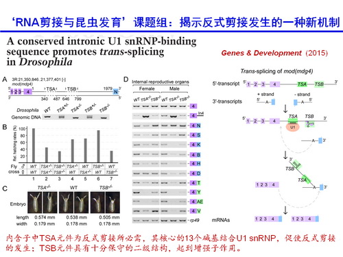 前期通过转录组测序与实验验证,研究组确认了家蚕中存在20个基因的65个反式剪接事件,发现其中的一些反式剪接产物阅读框可以编码完整的、来自于两个基因的蛋白质结构域,这在基因进化研究上具有重要的理论意义(Shao et al., 2012, RNA)。mod(mdg4)和lola 是昆虫中最经典的两个反式剪接基因,它们分别与昆虫的染色质重建和神经元功能密切相关。徐永镇研究组以mod(mdg4)为研究对象,通过细胞水平上的多种截短体和突变体研究,发现该基因反式剪接的发生取决于其5'共同转录产物的最后一个内含子中两个RNA片段,TSA与TSB。TSA与TSB的核心序列在基因组序列已知的12个果蝇属昆虫中高度保守。采用CRISPR/Cas9技术,在黑腹果蝇基因组中特异性地分别敲除这两个RNA片段,导致胚胎发育异常,孵化率明显下降。重要的是研究进一步证明TSA元件为mod(mdg4)基因反式剪接所必需,通过碱基配对,其核心的13 nt序列能够特异性地结合U1 snRNP,促使了反式剪接的发生, 并且TSA元件的单独存在就足以诱导反式剪接的发生。TSB元件具有十分保守的二级结构,起到反式剪接发生的增强子作用。研究还显示TSA元件也存在于昆虫的其它一些反式剪接基因中,如lola,从而揭示出高等真核生物中存在的一种新的反式剪接发生机制。