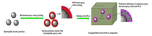 针对该问题,该团队首次利用高活性反应型生物基增容剂如环氧大豆油(ESO)、环氧腰果酚壳油(Epicard)、衣康酸环氧树脂、柠檬酸环氧树脂等对该类复合材料进行了界面改性研究,制备出了高性能且满足应用要求的全生物基可降解环保型聚乳酸复合材料。同时,对高活性反应型生物基增容剂如何改善亲水生物质刚性粒子与疏水聚乳酸基体的界面相容性进行了详细机理研究和分析(图1)。