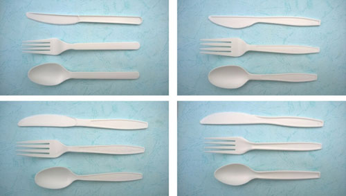 研究发现高活性反应型生物基增容剂改善聚乳酸/生物质填料界面相容性的主要原因是其在反应挤出加工中富集到生物质填料的表面,从而改变了生物质填料的亲水界面本质,实现了疏水聚乳酸在亲水生物质填料界面的浸润,从而提高了该类复合材料的界面相容性和机械性能,相关成果已发表(Carbohydrate Polymers, 2013, 92: 810–816; Carbohydrate Polymers, 2013, 94: 235–243; Carbohydrate Polymers, 2013, 95: 77–84;Composite Science and Technology, 2014, 94: 16-22; Composites Science and Technology, 2014, 90, 9-15; ACS Industrial and Engineering Chemistry Research, 2014, 53: 10653-10659; Journal ofApplied Polymer Science, 2015, DOI: 10.1002/APP.41220; International Journal of Biological Macromolecules, 2015, in press ),已获授权2项中国专利(CN201210123934.5; CN20121 0062675.X)。最终,通过该方法,研究人员制备出了符合应用需求的各种注塑、吸塑一次性可降解产品(图2,3),预计在不久的将来能够有效缓解“白色污染”的环境问题。