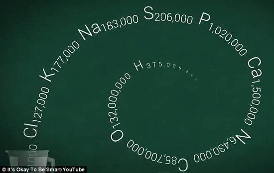 新浪科技讯 北京时间4月9日消息,你可能知道水的化学分子式是H2O,但你知道你身体的化学式吗?来自美国德克萨斯州的一位生物学家兼科学作家乔·汉森(Joe Hanson)博士就对这一问题进行了一番研究,计算出了人体的化学元素组成。