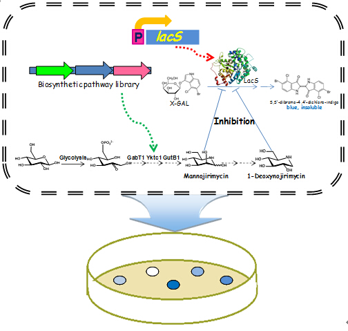 中国科学院微生物研究所研究员唐双焱课题组发现1-DNJ具有对β-半乳糖苷酶LacS的抑制活性,并利用这一特性建立了一种可以在琼脂平板上进行颜色筛选的高通量筛选方法。LacS是一种来源于Sulfolobus solfataricus的β-半乳糖苷酶,可以水解X-GAL为蓝色化合物。在大肠杆菌中表达来源于Bacillus spp.的TYB基因簇(包含gabT1、yktc1和gutB1三个基因)可以实现1-DNJ在大肠菌中的合成。将lacS基因插入到E. coli BW25113中,构建表达宿主菌BWLacS,后者在添加X-GAL的平板上生长时菌落呈现蓝色。在此菌株内表达TYB基因簇,由于合成的1-DNJ抑制了LacS的水解活性而使菌落蓝色变浅。当表达针对TYB基因簇构建的突变体文库时,因不同突变体合成1-DNJ的能力不同造成对LacS活性的抑制程度不同,使菌落呈现蓝白不一的颜色表型,1-DNJ合成量越高则菌落颜色越白,从菌落的颜色表征可以达到对胞内1-DNJ产量进行高通量筛选的目的。在此基础上,研究人员对1-DNJ在微生物中的合成途径进行了两方面的改造。首先,针对合成途径中的关键酶GutB1构建易错突变体文库,并利用研究中所构建的高通量筛选方法进行筛选,得到一株突变体,其1-DNJ合成量提高了54%。然后,通过对TYB基因簇不同基因间的可调区域建立突变体文库并进行筛选,期望对TYB基因簇中不同酶的表达通量进行优化,筛选到1-DNJ合成量提高68%的突变体。