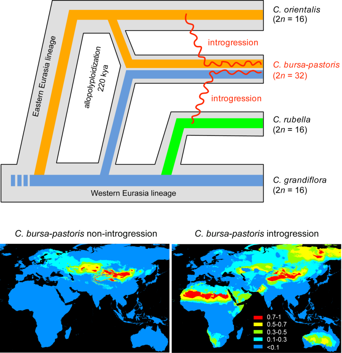 中国科学院植物研究所郭亚龙研究组以四倍体荠菜(Capsella bursa-pastoris)为例来探讨这一科学问题。荠菜是地球上非常成功的物种之一,分布在除热带之外的几乎所有地区,是回答上述问题的一个理想研究系统。该研究在全球广泛取样的基础上,结合细胞学、系统发育、群体遗传、溯祖模拟及生态位重建等多方面的研究结果,首次澄清了四倍体荠菜的异源多倍化起源,并发现其居群中存在频繁的来自于同域分布的二倍体近缘种的遗传渐渗。进一步的研究发现具有渐渗的荠菜居群可以占据更为广泛的生态位,因而具有更强的适应性。