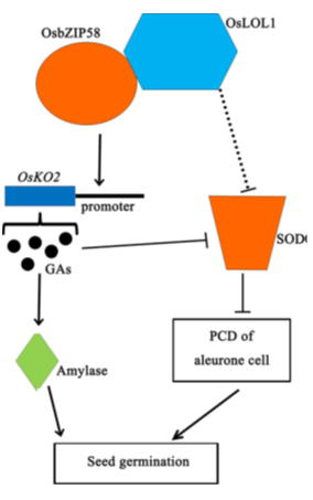 水稻抗病调控蛋白OsLOL1在水稻抗病中起到重要作用,但中国科学院微生物研究所植物基因组学国家重点实验室吴家和研究发现,OsLOL1同时也能够调控GAs生物合成继而影响水稻种子萌发。当水稻中OsLOL1基因被反义抑制后,GAs合成基因OsKO2表达下降造成其中间产物ent-kaurene大量积累。酵母双杂交和荧光互补实验结果显示,OsLOL1能与碱性亮氨酸拉链蛋白OsbZIP58互作。电泳迁移率与双荧光报告分析显示,OsbZIP58能结合OSKO2基因启动子中G-box顺式元件并启动Luc报告基因表达。此外,OsLOL1能下调SOD1基因表达并加速水稻糊粉层细胞凋亡。研究结果证明,OsLOL1与OsbZIP58互作促进OsKO2基因表达来调控GAs的生物合成,从而影响糊粉层细胞的凋亡和种子萌发。