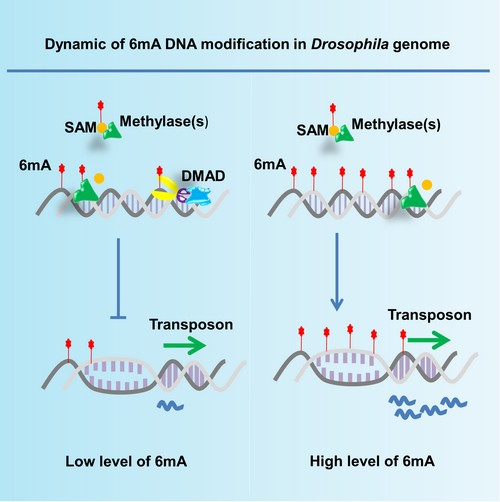 陈大华课题组和汪海林课题组的研究首次证明了果蝇基因组中存在6mA修饰,并且证明该修饰在胚胎发育的早期阶段受到去甲基化酶DMAD(果蝇Tet同源蛋白)的精确调控。研究者利用CRISPR/Cas技术制备了DMAD的一系列突变体,发现DMAD对于果蝇的生长发育是必须的,同时证明了DMAD在体内具有催化果蝇基因组6mA的去甲基化的功能。体外实验也表明DMAD具有直接催化6mA去甲基化酶的活性。此外,该研究对果蝇卵巢中DMAD调控6mA去甲基化的过程及功能进行了分析。通过进一步对DMAD突变体及野生型果蝇卵巢基因组DNA的MeDIP高通量测序,发现果蝇卵巢基因组中的6mA修饰经常发生于转座子区域,特别是在DMAD突变体中,位于转座子区域的修饰显著增加。表明DMAD可能通过降低转座子区域的6mA修饰来调控转座子的表达。该项研究揭示了真核生物DNA新修饰形式,在表观遗传研究领域取得了原创性的突破。