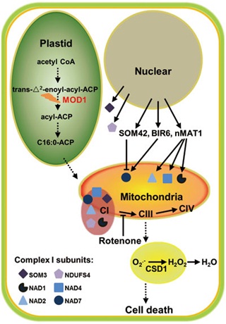 而SOM42编码一个线粒体定位的PPR蛋白,SOM42表达量的升高和降低均会影响线粒体复合体I亚基NAD7编码基因的剪接,从而使线粒体复合体I的组装及活性受到影响。mod1的细胞死亡表型和ROS积累可以被线粒体复合体I的突变体抑制,并且通过药物处理阻止线粒体复合体I产生活性氧,能够抑制mod1的突变表型。进一步研究表明,完整的线粒体是拟南芥对丁香假单细胞菌产生超敏反应和抗病反应所必需的。