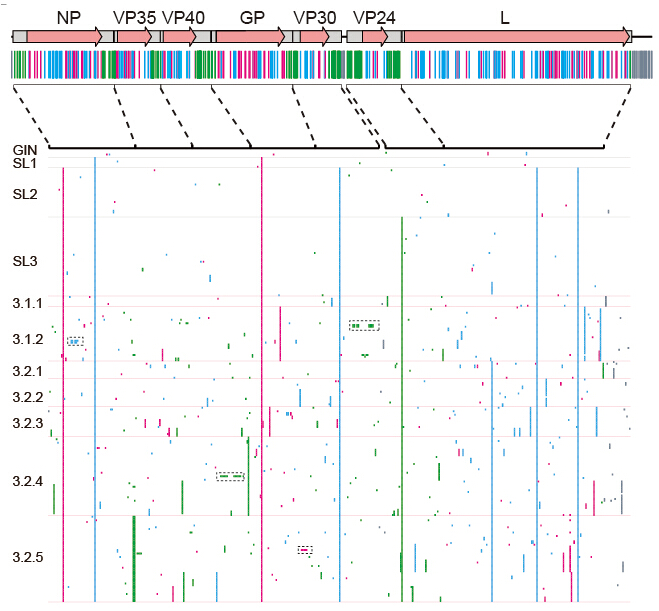 利用2014年7月至11月期间在塞拉利昂的五个大区检测的3000多份埃博拉病人样本,成功分离测定175株病毒全基因组序列。通过对于这些病毒基因组的系统分析,得到一系列重要的研究结论。首先,科研人员发现埃博拉病毒的进化速率相比于暴发初期明显降低,由每年每千个核苷酸位点2.03次突变减少为每年每千个核苷酸位点1.23次突变。之前以美国研究团队为主发表的研究成果提示埃博拉病毒突变速率远远高于历史数据,接近流感病毒的进化速率。这一结果引起了广泛的争论——进化速率的大幅提升将会给埃博拉疫苗和药物的研发造成巨大的影响。而此次最新数据和分析结果证实病毒的进化速率并未大幅提升,基本与历史平均速率相仿。推测之前的研究结果只是病毒特定进化时期的瞬时表现。