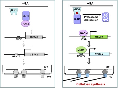 中国科学院遗传与发育生物学研究所基因组生物学研究中心/植物基因组学国家重点实验室周奕华研究组长期从事细胞壁生物合成机制研究。为明确赤霉素对纤维素合成的调控作用,周奕华研究组通过对水稻赤霉素相关突变体的细胞壁成分测定和基因表达分析,发现赤霉素合成缺陷导致茎秆机械组织厚壁细胞的细胞壁变薄,纤维素含量下降;而赤霉素信号转导抑制子突变和外施赤霉素均能上调纤维素合酶基因的表达,并增加纤维素含量,表明赤霉素可促进纤维素合成。分子生物学实验显示,赤霉素信号转导抑制子SLENDER RICE1(SLR1)与次生壁合成相关的顶层转录因子NAC29/NAC31直接相互作用,抑制其对下游转录因子MYB61的直接转录激活作用,进而影响MYB61对下游纤维素合酶基因的转录,调控纤维素合成。对发育中的水稻节间分段进行赤霉素含量测定和基因表达分析,显示该信号通路受内源赤霉素调控,并影响茎秆生长发育。遗传学和生物化学实验证实该类型的信号通路具有保守性,在拟南芥等双子叶植物中均存在。