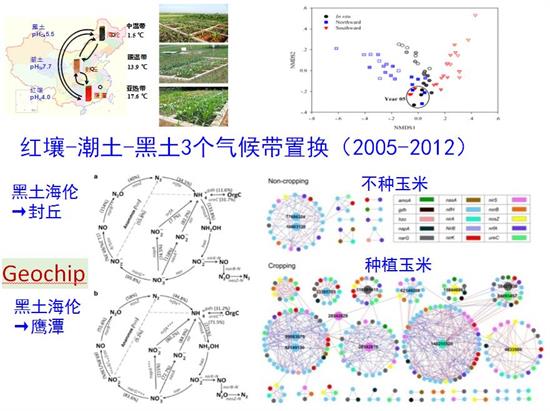 研究结果表明,气候变暖(土壤南移)和气候变冷(土壤北移)显著改变了潮土中土壤微生物群落结构,群落相似性表现出显著的时间衰减关系(time –decay relationship)。相比潮土原位的演替速率(w=0.046,P<0.001),土壤南移对微生物群落演替速率的促进作用(w=0.094, P<0.001))高于土壤北移(w=0.058, P<0.001),说明温度促进微生物的演替和竞争(代谢理论)。不同微生物对气候变化敏感性分异,放线菌门与厚壁菌门最敏感,变形菌门抗性最强。气候变暖对微生物群落结构演替的影响更为显著,与温度升高后微生物的代谢速率与种群间竞争关系增加有关 (Liang Y, et al. The ISME Journal, 2015)。气候变暖(土壤南移)显著增加了功能基因的多样性。氮循环功能基因丰度显著增加,且氮循环功能基因与土壤硝化显著正相关(r > 0.56, P< 0.001);碳循环功能基因(如碳固定、碳降解、甲烷循环等)丰度显著增加,且与土壤二氧化碳呼吸通量显著正相关(r = 0.72, P< 0.020)(Zhao et al. The ISME Journal, 2014)。气候变冷(土壤北移),土壤微生物生物量、群落结构都显著改变。气候条件(年平均温度、相对湿度)、土壤理化性质(pH、氨氮、有效氮)及植被是影响微生物群落结构的主要因素。氨氧化过程功能基因(amoA及amoB)的平均丰度均与土壤硝化潜势呈显著正相关(Yang et al. Environmental Microbiology, 2014)。于此同时,发现与裸地相比,种植作物增加了核心(Core)氮转化基因丰度和网络(fMENs)交互作用,关键基因由固氮基因转变为固氮+反硝化+硝化基因(汪峰,科学通报,2014)。上述结果为丰富跨气候带土壤微生物功能多样性对气候变化的响应提供了理论依据。