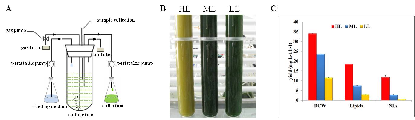 图示:氮源充足和不同光强条件下对微拟球藻的培养。(A)稳态连续培养方式示意图。(B)不同光强条件下培养管中的最终微拟球藻生长情况。(C)不同光强下生物质、油脂和中性脂的产率对比。HL,高光;ML,中光;LL,低光。