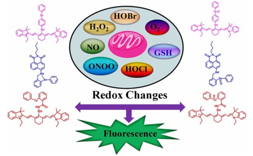 细胞内的氧化还原平衡主导着生物体的各种生理病理过程,而参与这一平衡的活性氧具有反应活性高、半衰期短等特点。因此,检测细胞内的氧化还原状态变化是一项非常具有挑战性又有重要生物医学意义的研究工作。近年来,韩克利研究组一直致力于发展用于检测活细胞内氧化还原状态变化的小分子荧光探针,模拟谷胱甘肽过氧化物酶的活性中心硒、碲类似物,采用不同的荧光作用机理,发展了一系列具有选择性好、灵敏度高、近红外吸收、快速响应等特点的荧光探针,并相继在J. Am. Chem. Soc.、Chem. Commun.、Phys. Chem. Chem. Phys.等杂志上发表了一系列文章。