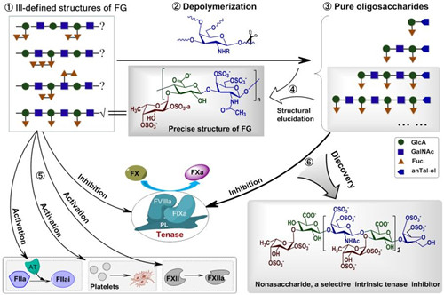 图1. 原型FG确切结构的阐明及选择性内源性因子X酶抑制剂的发现。(原型FG确切结构存在疑问①,其疑问通过糖苷键(GalNAc β1→)选择性解聚②所得纯化寡糖的结构解析③而得到阐明④;天然FG存在广泛药理学活性(如AT依赖的IIa抑制活性、血小板和FXII激活活性以及Tenase抑制活性)⑤,纯化寡糖(9-18糖)则选择性抑制内源性Tenase⑥)