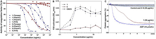 图2. 原型FG和纯化九糖(化合物5)对凝血因子(A,B)及血小板(C)活性的影响
